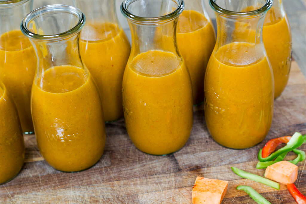 Voici ma recette de bocaux maison de velouté de patate douce et poivrons.