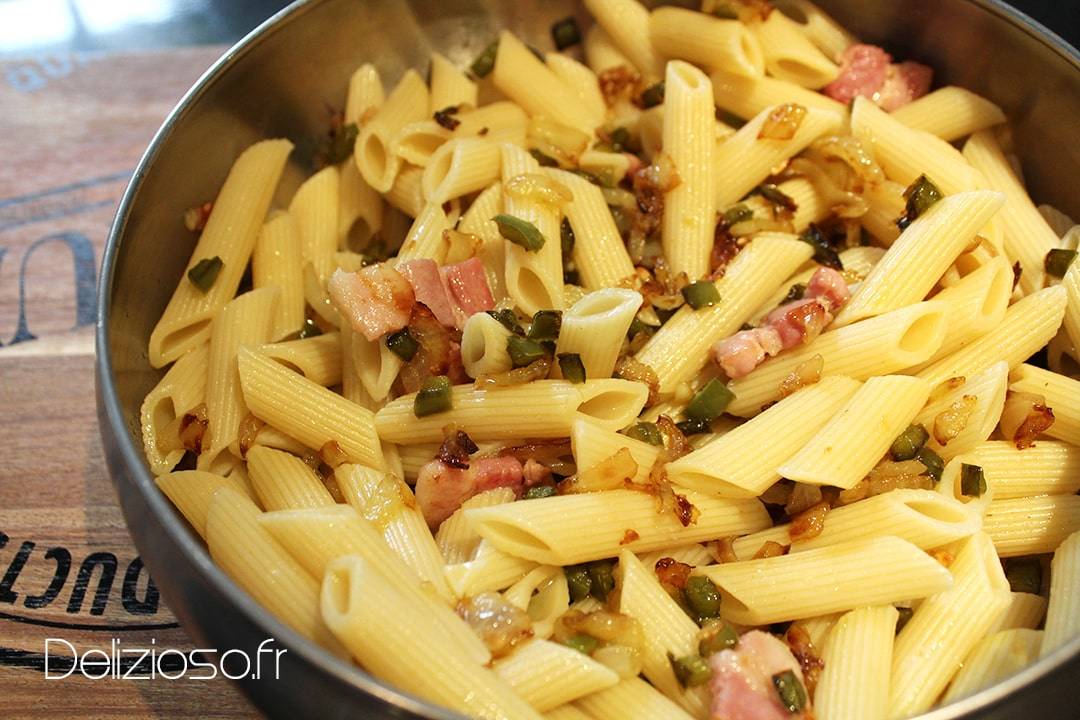 Aujourd’hui je vous propose une recette de pennes faite avec les restes du frigo, en l’occurrence un poivron vert qui me faisait de l’œil depuis quelques jours… hors de question que je le laisse perdre donc en rentrant hier soir j’ai commencé par le sortir du frigo. Ma fille m’a demandé « Qu’est-ce qu’on mange ? » (ça vous rappelle quelque chose ?)… et j’ai répondu… du poivron vert… des pâtes… des oignons…
